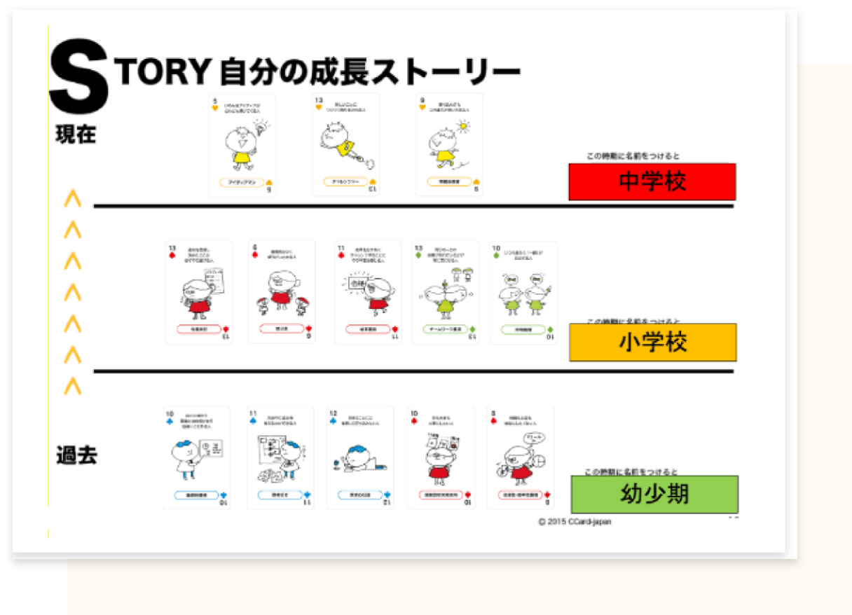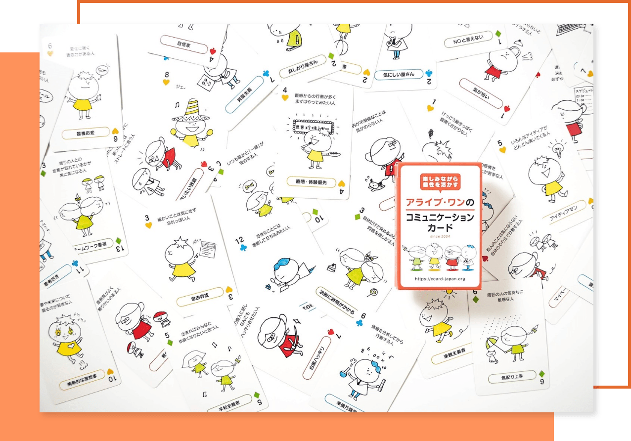 かわいらしいカードを使って、仲間と対話しながら楽しく自己分析を行います。今の自分の強みを知ると自信を持って次の1歩へ進めます。